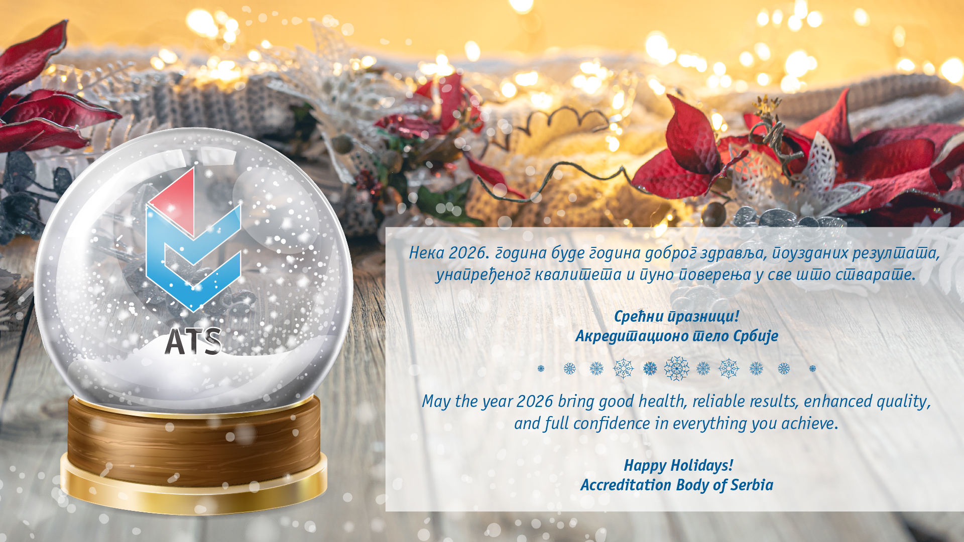 Na kraju još jedne godine uspešne saradnje, Akreditaciono telo Srbije sa zadovoljstvom upućuje novogodišnje i božićne čestitke svim akreditovanim telima, ocenjivačima, poslovnim partnerima i saradnicima.