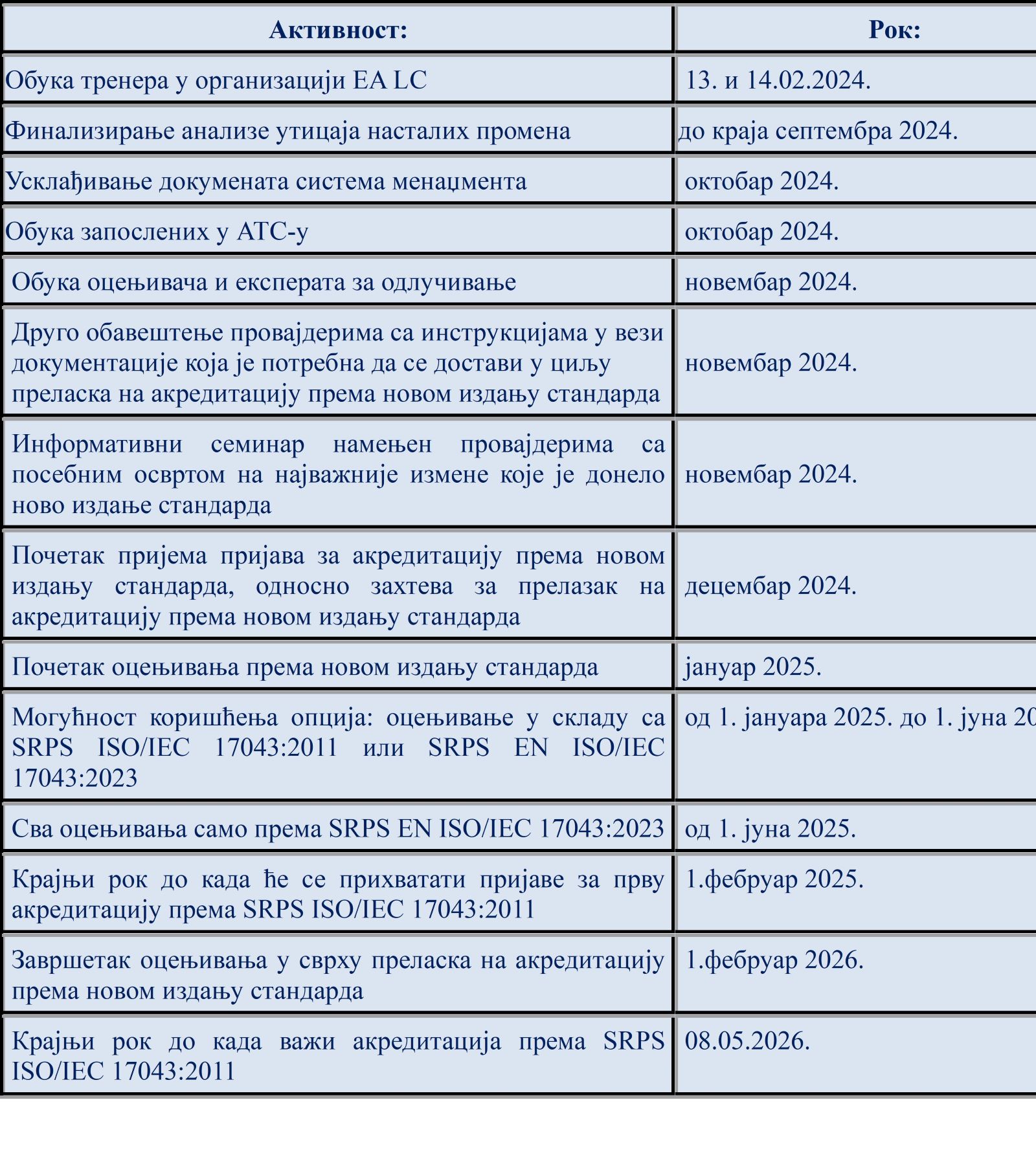 Имајући у виду да је ILAC Резолуцијом GA 26.09 из новембра 2022. године за прелазак на акредитацију према новом издању стандарда утврђен прелазни период од три године од датума објављивања стандарда, у сарадњи са Саветом за акредитацију утврђен је следећи редослед активности који ће омогућити да се спроведу одговарајућа прилагођавања у циљу преласка на ново издање стандарда са циљем да од 8. маја 2026. године буду важеће само акредитације према новом издању стандарда.